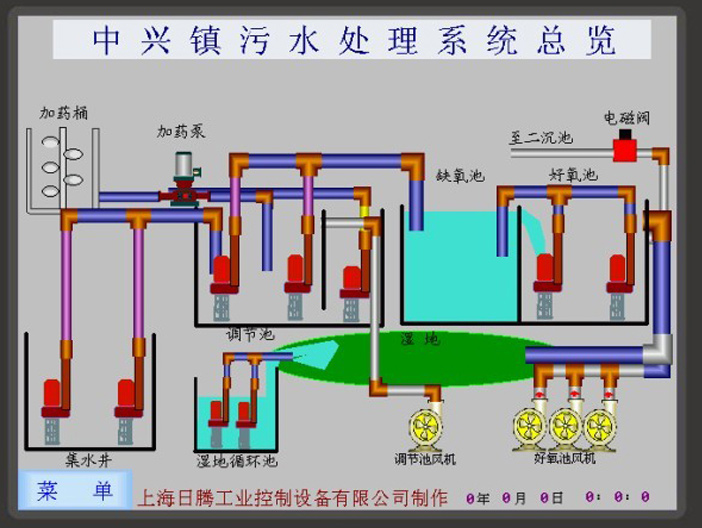 崇明县中兴镇生活污水处理厂,有着日污水处理量为100吨的污水处理系统,整个污水处理控制系统是一个高效可靠的污水处理控制系统,严格按照执行每个仪表检测的数据进行运行工作。整个系统由三菱FX系列PLC和维纶10寸人机屏、施耐德电气元件等组成完美、高效、可靠的污水控制系统。